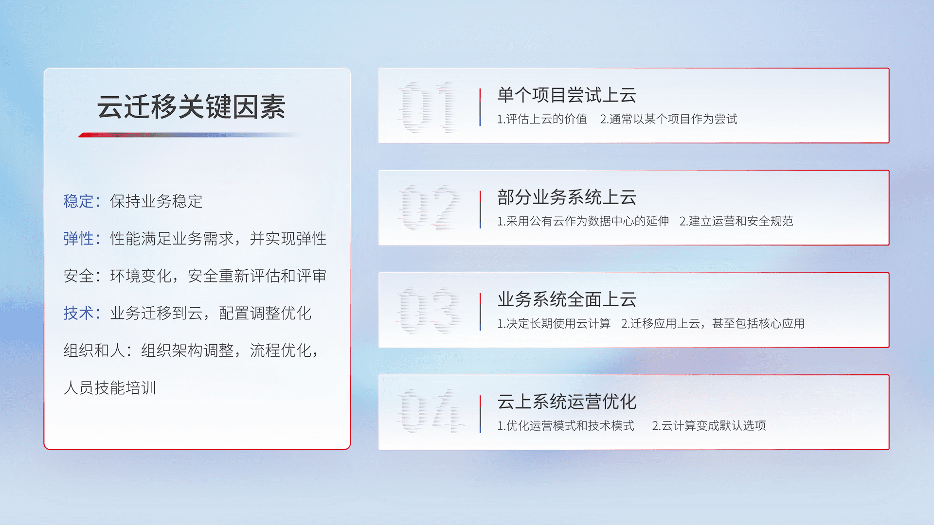 结合实际业务,,从规划设计、、云平台选型、、、、云原生改造、、数据迁移、、、、集成交付,,,迁移全过程为客户识别最佳上云路径,,,,做好风险识别管理,,设计网络架构、、身份权限、、安全审计合规、、、、操作审计、、、、日志审计、、、、监控告警策略、、多站点容灾设计等,,,对云上基础设施进行整体规划,,提升IT治理水平,,以满足弹性、、高可用、、、、高性能的需求。。。
